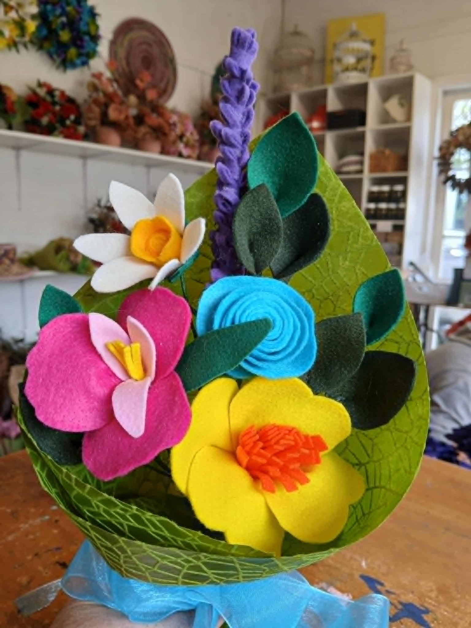 These bouquets feature 5 different felt flowers and 3 foliage stems. Each flower is hand cut and assembled using wool blend felt.